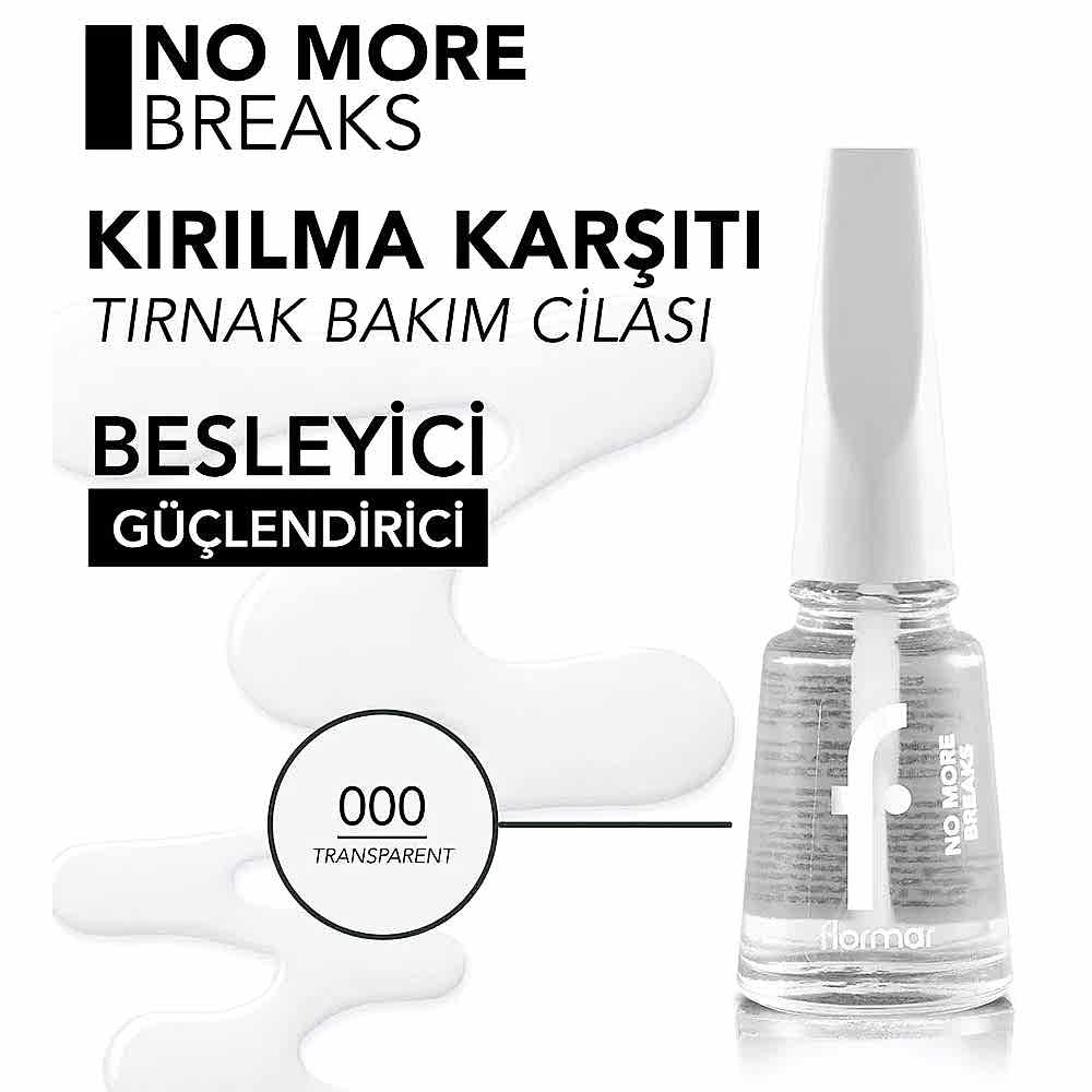 • Flormar No More Breaks, şeffaf bir tırnak bakım cilasıdır. Kalsiyum ve protein ile zenginleştirilmiş bir formüle sahiptir. Parlak bitişlidir.