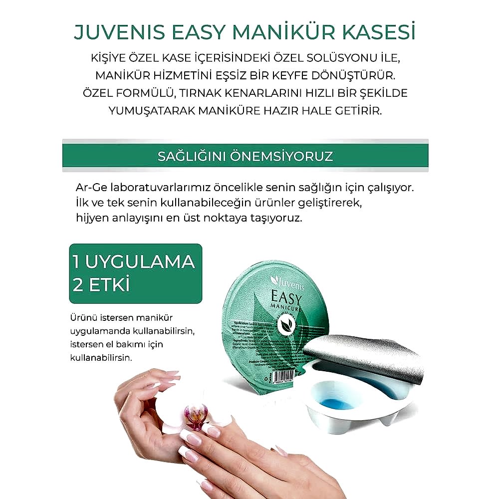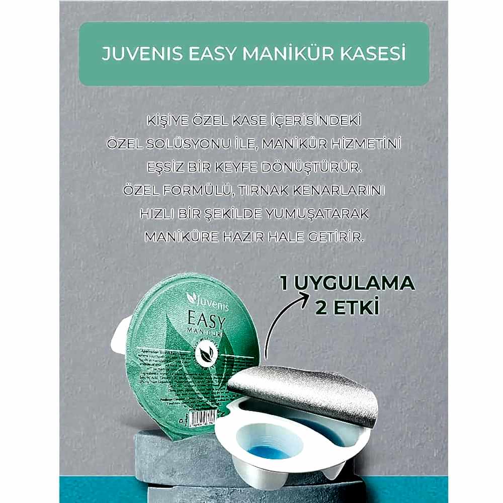 - Juvenis Easy Manikür Kasesi, kişiye özel kase içerisindeki özel solüsyonu ile, manikür hizmetini essiz bir keyfe dönüştürür.